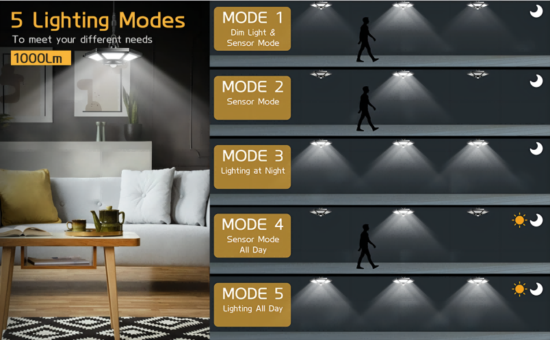 ORonahiyên şaneyên sensora tevgera rojê yên derve bi 5 modên ronahîkirinê.